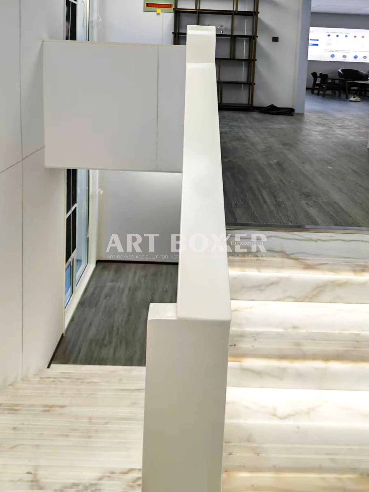樓梯與護(hù)欄設(shè)計(jì)兼具美觀與安全性能。室內(nèi)樓梯采用主體鋼制結(jié)構(gòu),踏步面層鋪設(shè) 18mm 厚天然大理石,搭配 LED 燈帶,既保證了使用安全,又提升了空間的檔次感。